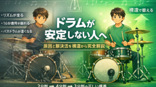 ドラムが安定しない原因を構造から解説。リズムが走る、16分音符が崩れる、バスドラムが速くなる悩みを順番と練習方法で解決します。