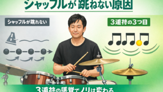 ドラムのシャッフルが跳ねない原因は「3連符の3つ目の感覚」にあります。本記事ではシャッフルのノリが出ない理由と、3連符の感覚を身につける具体的な練習方法を初心者向けに分かりやすく解説します。