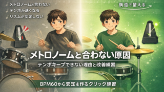メトロノームと合わない原因をプロドラマーが解説。テンポキープできない理由、クリック練習方法、BPM60からの練習手順まで初心者向けにわかりやすく解説します。