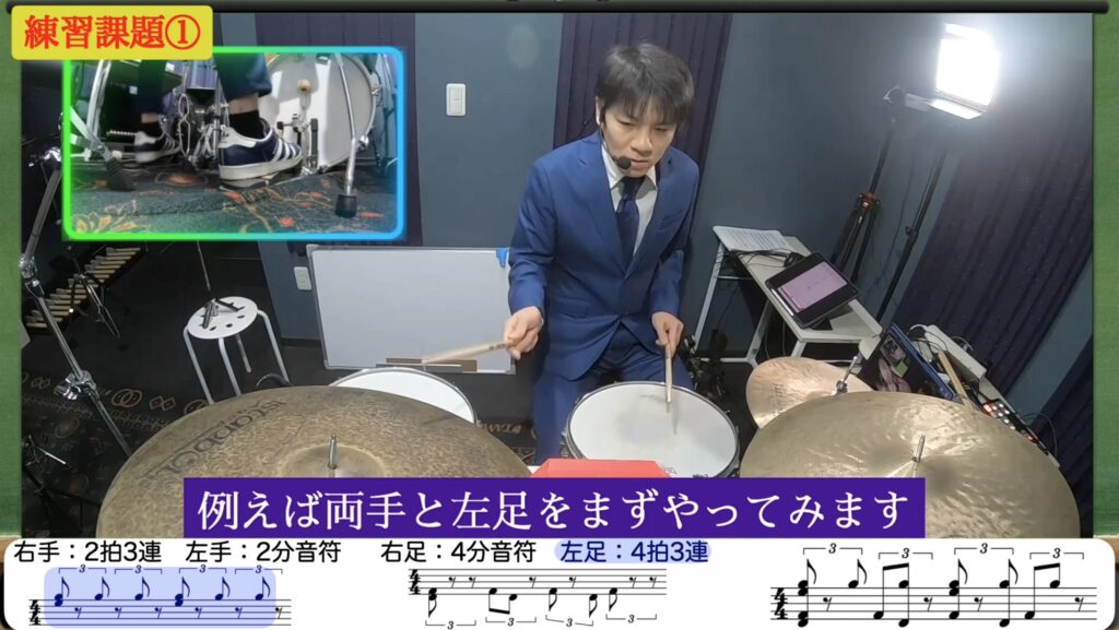 右足4分音符をキープしながら4拍3連を叩きます。