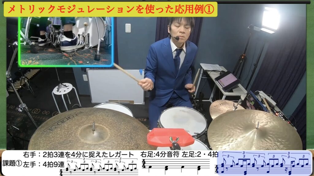 右足4分音符を鳴らしながら4拍9連を叩く。