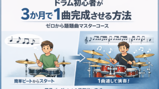 ドラム初心者が「1曲も完成しない」まま挫折しないための3か月集中コース。簡易バージョンから始め、全12回で課題曲を最後まで止まらず演奏できるように進めます。