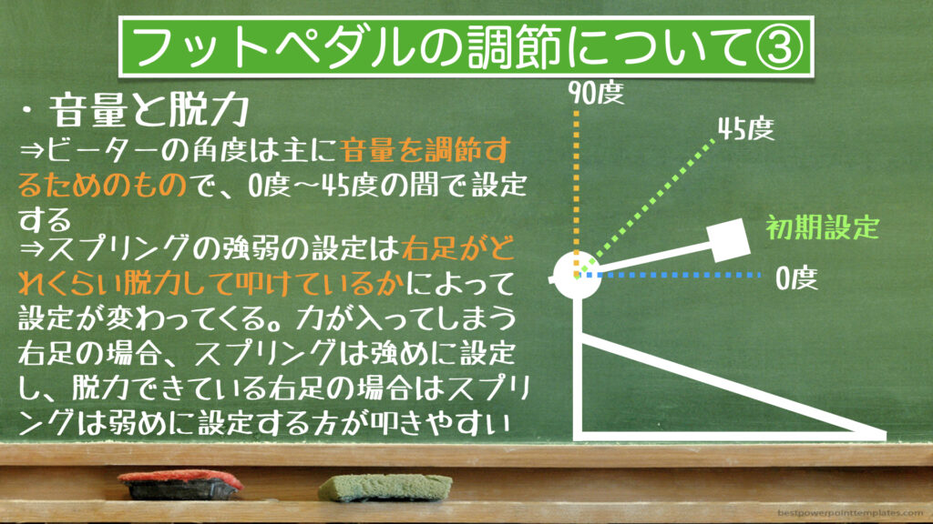 右足の脱力が進んだり、高速連打に慣れてきたり、コントロール力が上がってきたりするとペダルを調整することでさらにやりやすくなります。