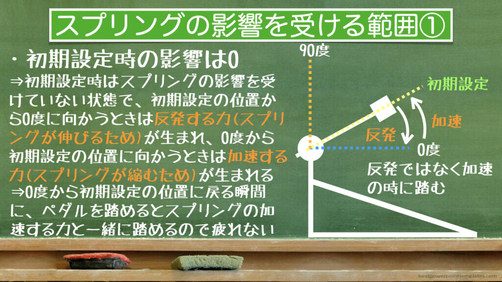 次に初期設定から90度に向かう時はスプリングが伸びるため反発します。90度から初期設定に戻るときはスプリングが縮むため加速します。