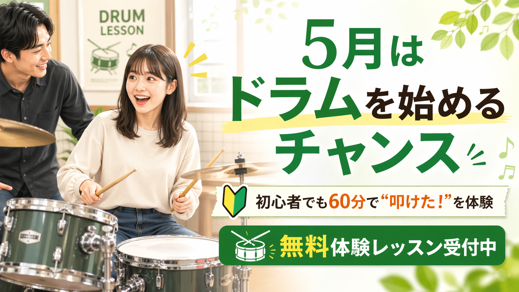 今回は、なぜ5月がドラム初心者にとって始めやすい時期なのか、そして当教室の無料体験レッスンでどんなことができるのかを、わかりやすくご紹介します。
