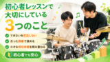 当教室の無料体験レッスンは、ほとんどの方がドラム未経験からのスタートです。そのため、最初から難しいことを求めることはありません。