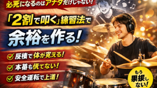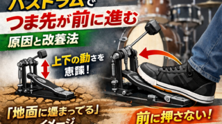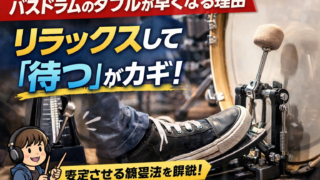 バスドラムのダブルが不安で早くなってしまう方へ。意識しすぎて力んでしまう原因と、リラックスして安定させるための具体的な練習方法をわかりやすく解説します。